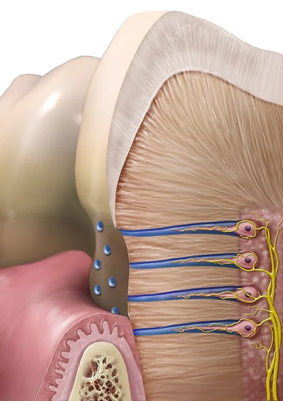 Different stimuli cause fluid movement within the dentinal tubules and disturb the tooth cells and stimulate the nerve fibers in the pulp, resulting in the painful “zinging” or aching sensation. Cold, heat, sweet or acidic food/drink, and touch are examples of the stimuli responsible for dentin hypersensitivity.